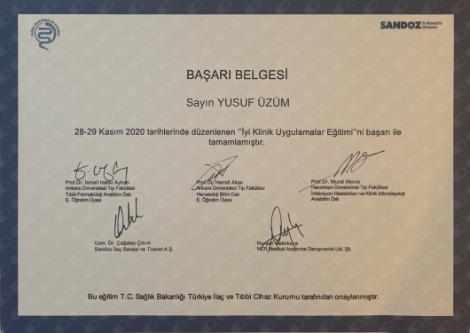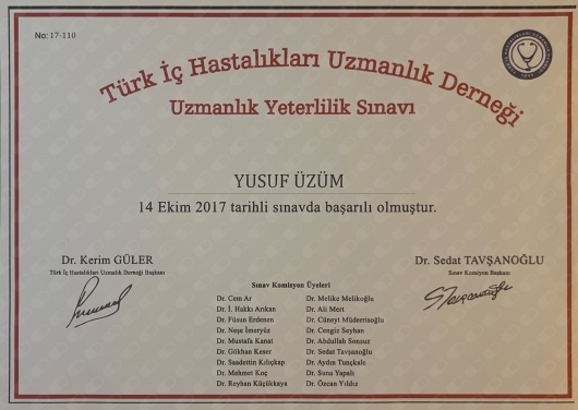 Türk İç Hastalıkları Uzmanlık derneği tarafından yapılan İç Hastalıkları tıbbi bilgi ve becerinin ulusal ve uluslararası yeterliliğini test eden Board sınavını derece ile başarılı bir şekilde geçerek sertifika almaya hak kazanmıştır.