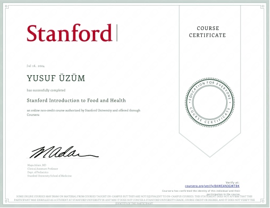 Amerikanın en önemli üniversitelerinden biri olan Stanford Üniversitesinden "SAĞLIKLI BESLENME" eğitimi ve sertifikası almıştır.