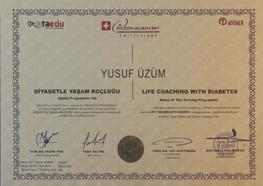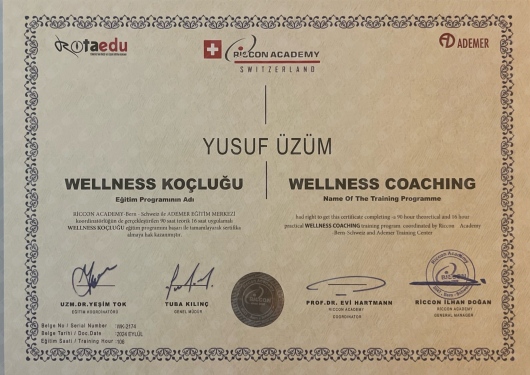İsviçre Riccon Academy'den aldığı "Wellness Koçluğu (sağlıklı yaşam koçluğu) " , "Fitoterapi " ve "Diyabetik hastada yaşam koçluğu" sertifikaları bulunmaktadır.