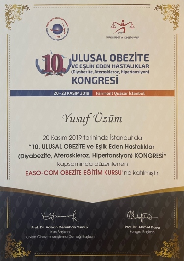 Ayrıca EASO Avrupa obezite cemiyetinin Türk Obezite Vakfı ile ortak düzenlediği "EASO-COM OBEZİTE EĞİTİM" kursunu başarıyla tamamlamış ve sertifika almaya hak kazanmıştır.